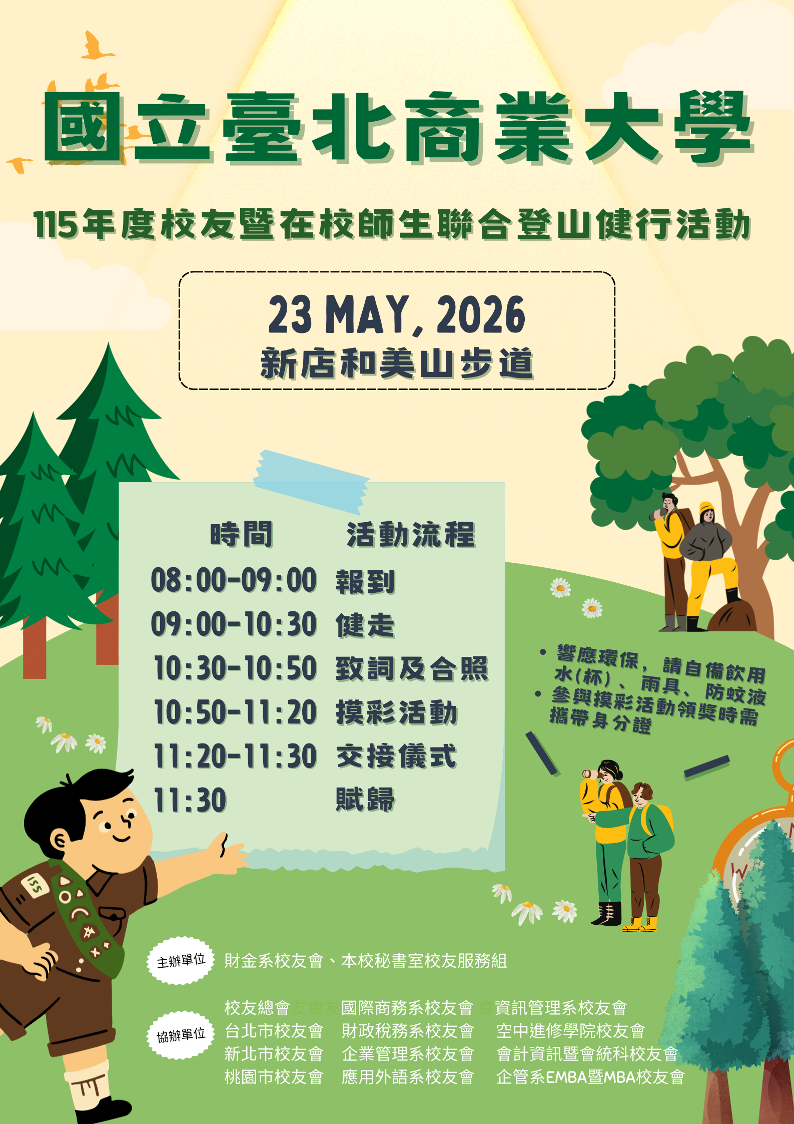 協辦單位:校友總會、臺北市校友會、新北市校友會、桃園市校友會、空中進修學院院友會、會資暨會統校友會、商務系校友會、財稅系校友會、企管系校友會、資管系校友會、企管系EMBA暨MBA校友會、應外系校友會。